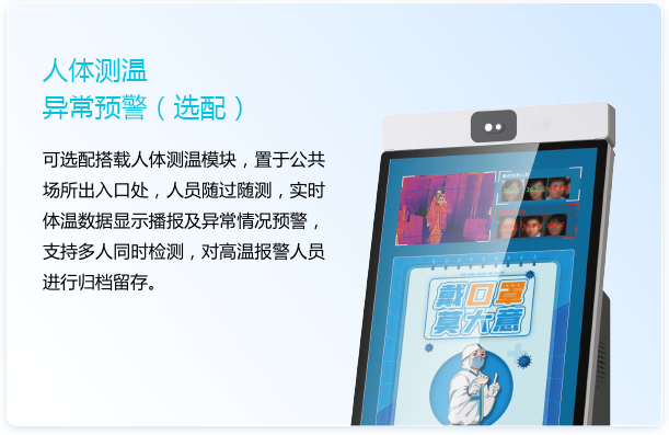 32寸主屏搭載可定制化模塊,提供迎賓接待、業(yè)務(wù)咨詢、體溫監(jiān)測(cè)等特色服務(wù)的智能大屏機(jī)器人?蓪(shí)現(xiàn)接待講解、引導(dǎo)跟隨、宣傳巡邏等功能,還可提供人臉識(shí)別、二維碼掃描、身份證讀取、叫號(hào)、打印等特色服務(wù)。