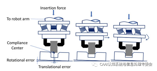 RCC是由Whitney和Nevins發(fā)明的,用于幫助機(jī)器人完成插入和裝配任務(wù)[41]。在他們的研究中,他們廣泛地討論了機(jī)器人的插入過程[42]。在插入過程中,銷釘會在軸向旋轉(zhuǎn)夾持器下傾斜,這稱為柔性中心。如圖3所示,RCC裝置實際上是一個有6個自由度的彈性機(jī)構(gòu),可以改變系統(tǒng)柔度中心的位置。在[43]中開發(fā)了一種具有計算機(jī)可調(diào)阻抗的主動柔性末端執(zhí)行器。目前,將RCC與其他設(shè)備或控制方法相結(jié)合是非常有研究價值的課題。