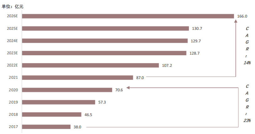 此外,在中國勞動力成本持續提升、傳統制造業對產業效率與產品檢測準確度的需求提升、機器視覺技術可替代人工完成G效率與G精度等背景下,中國機器視覺相關產品需求量將隨之增長。截至2021年,中國機器視覺市場規模已達87億元,隨著產業下游應用L域持續拓寬,市場規模有望從2021年87億元增長 至2026年的166億元,CAGR為14%。