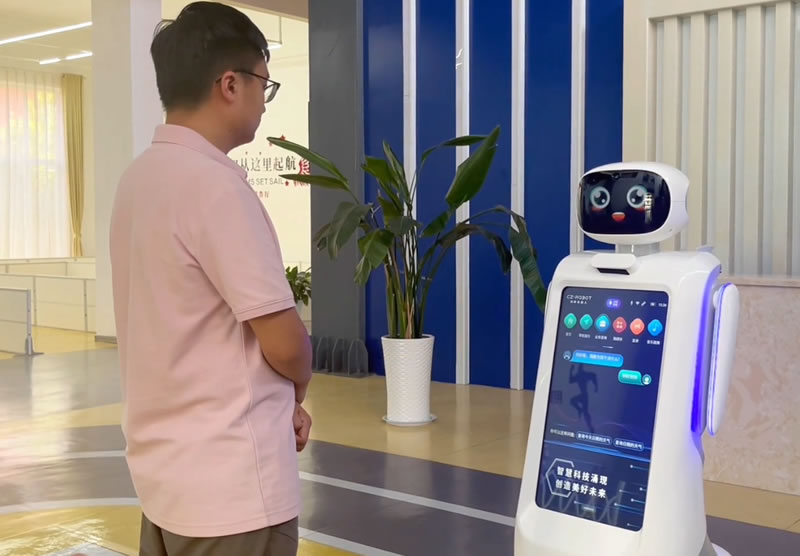 創(chuàng)澤迎賓機器人采用類人形設(shè)計,擁有頭部、頸部、手臂、軀體,給人更好的親近感。集禮貌迎賓、自主導(dǎo)航功能、互動交流等功能為一體,能夠帶L訪客參觀展廳、介紹各項業(yè)務(wù)、回答來賓提問、負(fù)責(zé)一系列解說,不僅生動活潑,也節(jié)省了人力和時間成本
